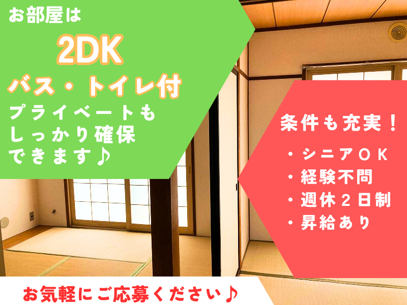 アピールポイント: 管理人のお部屋を写真でご紹介! 完全個室で安心♪ ≪3つのポイント≫ ◎風呂・トイレ別 ◎オール電化 ◎家賃・光熱費、無料! ★住み込みのお仕事★ 家賃と光熱費が無料だから毎月の固定費も抑えられます。 赴任時の引越費用も当社負担です。 こんな方にお勧め! 料理を作ることが好きな方、人の役に立つ仕事・誰かに喜んでもらえる仕事がしたい方、歓迎します!! 仕事内容は家事そのもの! 普段から料理や掃除などの家事をしている方なら問題なく働けます♪ 勤務について 実働は8時間ですが、勤務する寮によって勤務シフトは若干異なります。 ≪一例≫ 5:30~10:00頃まで(実働3.5時間/休憩1時間) 朝食の準備・後片付け 10:00~15:00 自由時間 買い物や散歩などの外出OK! 15:00~21:30(実働4.5時間/休憩2時間) 夕食の買い出し・夕食の準備 後片付け 夕食の後片付けが終わる21時半頃には1日の仕事が終了します。