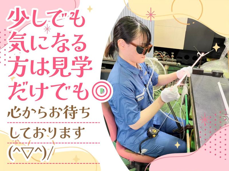 仕事内容 ★未経験から専門技術があなたの手に! ☆形に残す感動と楽しさが味わえる! ★ほぼ残業なし&夜勤なし!休みやすさ◎ ☆試験に合格すると合格金支給♪ ★暑さ対策ばっちり!休憩も自由! 「石英ガラス」と呼ばれる 特殊なガラスを使い ガラス加工を行う 製造スタッフを募集します。 ――――――――――――――――――― 仕事も趣味もものづくりで大満喫! 20代溶接女子がのびのび成長中♪ ――――――――――――――――――― DIYやハンドメイド、プラモデル組立など 「創作活動が好き・趣味」という女性が 持ち前の集中力と器用さを活かし 溶接工として現在活躍しています! 仕事では生活に欠かせない製品作りで 成長の嬉しさや形に残る感動を楽しみつつ、 オフの日は趣味に夢中になれる! ものづくりに興味のある若手女性が なぜキラキラと輝く生活を楽しめているのか 実際に働くスタッフに聞いてきたので ご紹介しますね♪ / 形に残る達成感がたまらない! お客様の感謝の声もやりがいです♪ \ 溶接工の魅力は 努力や頑張りが製品として 目に見える形で残ること! 知識や技術がまったくなしで入社。 火を扱うことも不安でしたが 丁寧な指導のおかげでメキメキ成長。 たった数年で難しい作業にも 挑戦できるようになりました。 ついこの前は、お客様が 私が作った製品を高く評価し、 お褒めの言葉をいただけました! 本当に嬉しかったです! お客様や生活に欠かせない製品を 自分の手で生み出していると 実感できた瞬間でした◎ 勤務中は人よりも “モノ”と向き合う時間が長い分、 集中力も必要とはなりますが、 1つのことを極める面白さや できないことができるようになる嬉しさ、 社会への貢献が病みつきになりますよ! / 趣味の時間も収入も ばっちり確保できています! \ *残業ほとんどなし *賞与年2回支給&決算賞与支給 *有給消化率ほぼ100% *半休だけなど調整も可能 第1・第3土曜は出勤日ですが、 有給で土日祝休みにする人も多数♪ 今年の夏と冬の長期休暇は どちらも9連休あるので 遠出の旅行も趣味に費やす時間も しっかり確保していただけます! (もちろん有給なしで9連休です!) また、業績によっては 決算賞与が支給されることも! 「時間はあってもお金がなくて…」 と趣味や遊びを我慢する必要はありません♪ / 何より大切にされていることが 安心して働ける最大の理由です! \ 「楽しく安心して成長してほしい」 と先輩や会社から大切にされていると 実感できる温かい職場です。 勤務中は重たい荷物や危険な薬品を 運ぶ必要があるときは、 どの人も快く手伝ってくれますし、 困った時は手厚いサポートを 受けられています。 休憩中などは ものづくりやアニメ好きな人が多いので、 年齢関係なく趣味の話で盛り上がることも♪ 月に1回、20・30代で若手会を実施! 時間を忘れるほど いつも大盛り上がりなんです(笑) 他にも、私のような女性社員のために 専用トイレも用意してくれたり、 今後男女別の更衣室を作る計画も してくれているみたいです! こんな風に部署や性別、年齢など まったく関係なく仲良しな職場なので 新人さんもすぐになじめますし、 人の温かさを感じていただけますよ。 ――――――――――――――――――― 【具体的なお仕事の流れ】 (1)設計図の形にガラスを切断 ▼ (2)切断した箇所を 機械を使って研磨(磨く) ▼ (3)ガスバーナーで溶接・曲げ加工 ▼ (4)電気炉や薬品を使用し 細かい汚れを取るなど仕上げ作業 【身体第一で働ける取り組み】 作業の中には、 ガスバーナーで素材を曲げるなど 火を扱う仕事もあるため、 暑さによる身体への負担が 少しでもやわらぐように… ★空調服支給 ★1時間ごとに休憩を会社が推奨 ★適度にクールダウンOK ★自由に飲める飲み物飲んでOK ★熱中症ドリンクは会社に常備 など暑さ対策を徹底。 休憩や水分補給の声かけは 工場長がこまめに行いますが、 自主的にもとりやすく 暑さを我慢せずに働けます! 【入社後のステップアップ】 まずは「座学研修」からスタート! 製品や製造工程、ガラス加工について 基礎を学んで頂きます。 その後は、実践形式で ガラスの切断作業から 業務を1つずつ学んでいきます。 ベテラン社員が横につき 丁寧に指導していくのでご安心ください! 一通りの業務を習得した後も 毎週勉強会を行っているので 常に知識や技術が学べる環境です。 ―――――――――――――――――――