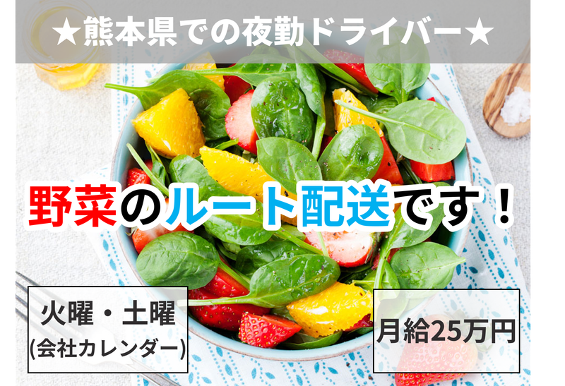 仕事内容 ✅お仕事内容 植木、山田青果にて、荷物集め・振り分けなどを行い、 4トントラックに乗って、店舗へ荷物を積みこみます。 その後、ダイレックスムサシプラザ店・ダイレックス御船店まで 商品を運び、山田青果に帰ってくるお仕事です。 ⭐トラック持ち帰りも可能です!! 基本的には、武蔵~御船1台で積める量をお願いします。 連休などある場合は各店舗1便の時あります。 武蔵、御船にて、カゴ台車のバックヤードに荷卸しあります。 ~その他、詳細は面談にて!~