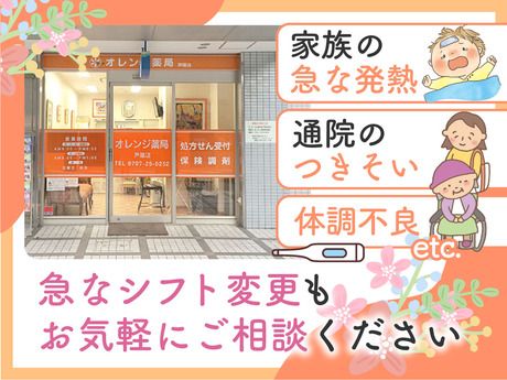 職場環境 【従業員構成】 <20代~50代の主婦パートさんが活躍中> 小さいお子さまのいる子育て真っ只中のママさん 子どもが大きくなって時間に余裕ができたママさん 家計の足しやお小遣い稼ぎに働くママさん キャリアアップを目指しているママさん いずれは正社員を目指しているママさん …など、いろんなパートさんがいます♪ <株式会社オレンジホールディングス> 地域のかかりつけ薬局として 全国に約140店舗の調剤薬局を 展開しています。
