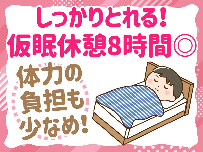 勤務時間詳細 実働時間:1日あたり16時間 平均勤務日数:1ヶ月あたり12日 〜 20日 9:00~翌9:00(休憩・仮眠8h) ※その他シフト有 週3・4~応相談 ※巡回は24時間勤務で1日5回ほどあり シフトサイクル:1ヶ月