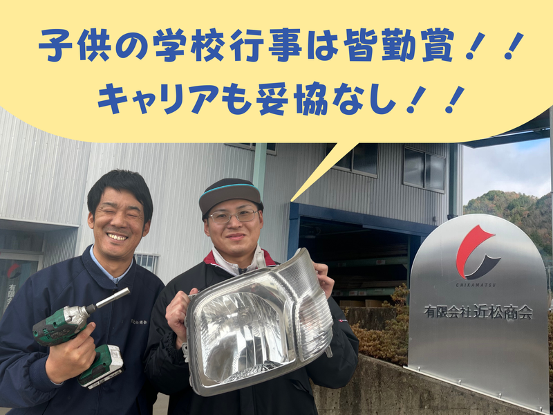 仕事内容 当社は、事故車や中古車を解体し、 まだ使える部品を取り外し、販売する、 ”自動車のリサイクル”の会社です。 今回、私達と一緒に働いてくれる 「自動車の中古部品の生産スタッフ」を募集! 専門知識や経験は一切不要です。 まったくの未経験でも 先輩がしっかりサポートするので ゼロからスキルアップが可能。 やりがいある仕事で楽しく働きませんか? ――《 この求人の魅力ポイント 》―― ✅創業約50年の安定企業 ✅未経験から月給25万円以上可能! ✅異業種からの転職者が多数 ✅20代~30代を中心に活躍中 ✅残業ほぼなし×基本定時の17時半終了 ✅土日祝休み/年休110日/長期休暇あり ✅昇給年1回/賞与年2回/決算賞与 (業績による/10年連続支給) ✅柔軟な働き方が可能:実働7~7.5時間 ✅合計90分の休憩(午前・昼・午後) ✅休憩時間の飲み物代など支給◎ ✅資格取得を支援!昇給につながります♪ ―――――――――――――― 仕事内容について ―――――――――――――― ⭐どんな業務があるのか? ・・・・・・・・・・・・・・・・・・・・・・・・・・・・・・・・ 具体的には、以下の業務をお任せします。 □事故車や中古車から部品の取り外す作業 (ドア、ヘッドライト、タイヤホイール、 エンジンなど) □取り外した部品の洗浄・状態確認作業 □部品を倉庫で保管・管理する作業 □YAHOO!や専用システムで部品販売業務 □販売した部品の出荷作業 ▶▶重たいものはリフトで運ぶのでラクラク ⭐車に詳しくなくても、問題ナシ! ・・・・・・・・・・・・・・・・・・・・・・・・・・・・・・・・ 当社では先輩スタッフがマンツーマンで 優しく丁寧に指導します! この仕事は自動車の構造や部品の名称、 車両の状態の見極め方など、 自動車整備やリサイクルに関する 専門知識が自然と身につきます。 中古部品の取り外し・点検、 洗浄などを経験することで ”自動車のプロ”としての基礎が身に付き、 未経験入社でも自信をもって 作業ができるまでに成長します。 だから業界未経験や、車に興味が無くても 安心してご応募してください! ⭐一日のスケジュール例 ・・・・・・・・・・・・・・・・・・・・・・・・・・・・・・・・ 8:00/出社・作業内容の確認、準備 8:10/現場作業開始 10:00/午前休憩(15分) 10:15/作業 12:00/昼休憩(60分) 13:00/作業 15:00/午前休憩(15分) 15:15/作業 17:30/終業・帰宅・お疲れ様でした! ※休憩:午前・昼・午後の合計90分 ⭐こんな方にオススメです ・・・・・・・・・・・・・・・・・・・・・・・・・・・・・・・・ □自動車が好き!車いじりが趣味 □ムリなく長く働きたい □まじめで協調性が高い □”やりがい”や”成長”を重視している □安定した地元企業で職場で長く働きたい □家族などプライベートも大切にしたい □環境保護やリサイクルに興味がある □リフトや整備士などの資格を活かしたい ⭐キャリアアップもできます ・・・・・・・・・・・・・・・・・・・・・・・・・・・・・・・・ ・定期的な面談制度によるフォローアップ ・充実した研修制度や資格制度 入社2~3年でも適性ややる気次第で管理職へのステップアップも可能 成長を仲間同士で支えあい、 新人の意見でも通りやすい、 温かいチーム文化が弊社の取柄です☆彡 ✅HPもご覧ください ・・・・・・・・・・・・・・・・・・・・・・・・・・・・・・・・ https://www.scrap-ckmt.com/ 2027年に設立50年を迎える安定企業。 故障・事故・買い替えなどで廃棄される 自動車を丁寧に解体し、再生可能な 部品・素材を選別します。 国内外へ“リサイクルパーツ”として 販売しています。 ◆TikTok・Instagramで社内の様子も紹介 『有限会社近松商会』でぜひご検索下さい!