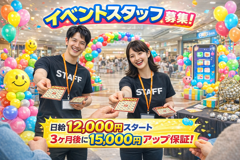 仕事内容: 「ここがPOINT!」  ̄v ̄ ̄ ̄ ̄ ̄ ̄ ̄ ̄ ̄ ̄ ̄ ̄ ̄ ̄ ̄ ̄ ⭐️ イベントスタッフ大募集! 笑顔と元気であふれる職場♪ 毎日が楽しいお仕事! 「お客様を笑顔にする」ことが仕事の中心だから、自然と元気がもらえる! 明るい笑顔でお客様と接し、ポジティブなエネルギーを広げよう! 温かい雰囲気の中で、みんなで楽しい時間を作り上げよう! ✅ 最初は慣れなくて当たり前! できることから少しずつでOK。 コツコツ続けられる方が、自然と長く活躍しています◎ ✅ 20〜30代の若手が中心で話しやすい! 明るくフレンドリーな雰囲気で、 誰でも気軽に話せます! ✅ 高日給スタート! 日給12,000円スタート 3ヶ月後には日給15,000円にアップ保証✨ 頑張り次第でさらに高収入も可能! ✅ 未経験でも安心スタート! 台本とマニュアル完備だから、 「いらっしゃいませ」と声をかけるだけでOK! 誰でもすぐに働けます。 「仕事内容は?」  ̄v ̄ ̄ ̄ ̄ ̄ ̄ ̄ ̄ ̄ ̄ ̄ ̄ ̄ ̄ ̄ ̄ 「売る」わけじゃなく、場を盛り上げるだけ! ショッピングモールで行われる携帯イベントのサポートです! 主な仕事は、声をかけること。 ⭐️ 主な業務内容 ・ビンゴ大会や抽選会への参加促し ・ティッシュやノベルティの配布 ・イベント会場への誘導 ・携帯利用状況に関する簡単なアンケート ⏩ ノルマなし! 難しいことは一切なし! 操作説明や契約は社員が担当 困ったときはすぐにサポートするので、 安心してスタートできます! 「こんな方におすすめ!」  ̄v ̄ ̄ ̄ ̄ ̄ ̄ ̄ ̄ ̄ ̄ ̄ ̄ ̄ ̄ ̄ ̄ ✨「楽しくマイペースに働きたい」方にぴったり✨ ・子どもと関わるのが好きな方 ・人と話すのが苦にならない方 ・ワイワイした空気が好きな方 ・笑顔で過ごす時間を大切にしたい方 ・ゆったりした時間も前向きに楽しめる方