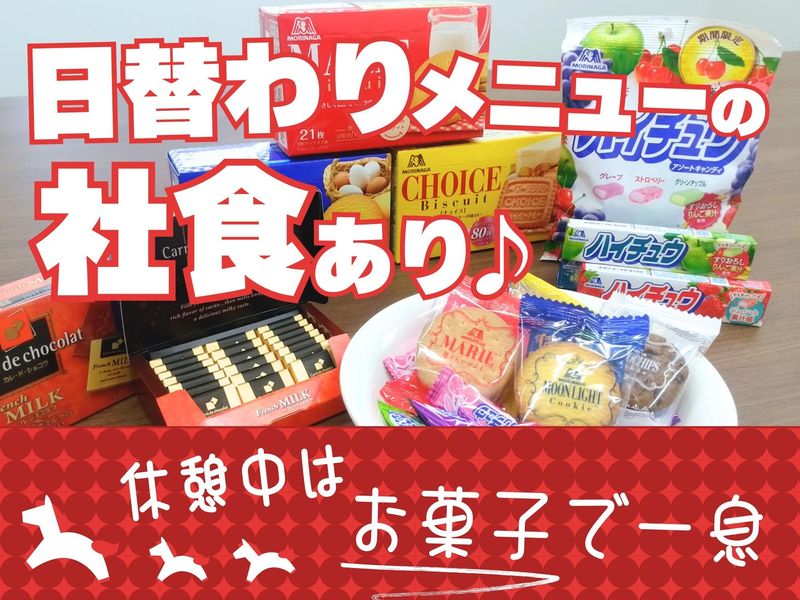 【保険制度】 雇用保険、労災保険、健康保険、厚生年金 待遇・福利厚生 【福利厚生】 〇賞与あり(年2回)  ̄ ̄ ̄ ̄ ̄ ̄ ̄ ̄ ̄ *1年未満の在籍者 ・・1万5000円(1回目) *1年未満の在籍者 ・・基本日給の10日分(2回目) *2年以上の在籍者 ・・基本日給の15日分(3回目以降) . 〇昇給あり  ̄ ̄ ̄ ̄ ̄ *年1回(規定の評価制度で決定) . 〇交通費支給  ̄ ̄ ̄ ̄ ̄ ̄ *車、バイク通勤のガソリン代を支給 ・・・1キロ以上距離がある場合) *電車、バス等の公共交通機関も支給 *無料駐車場あり . 〇社員食堂完備(当社一部負担)  ̄ ̄ ̄ ̄ ̄ ̄ ̄ ̄ ̄ ̄ ̄ ̄ ̄ ̄ *日替わりで4種類あります! ・・定食、丼ぶり、麺類、軽食 食品工場のため、 衛生上の観点により、食品などの 持ち込みを禁止としております . 〇食堂・休憩室フリーWifiあり  ̄ ̄ ̄ ̄ ̄ ̄ ̄ ̄ ̄ ̄ ̄ ̄ ̄ 〇制服貸与(クリーニング費用完全無料)  ̄ ̄ ̄ ̄ ̄ ̄ ̄ ̄ ̄ ̄ ̄ ̄ ̄ ̄ ̄ ̄ ̄ ̄ 〇正社員登用有(規定あり)  ̄ ̄ ̄ ̄ ̄ ̄ ̄ ̄ ̄ ̄ ̄ ̄ *契約社員として勤務後、 翌年から正社員になる方もいます . / 社員食堂等も完備しております! 昼食などは日替わりのメニューを 低価格で食事可能です! \ . <先輩スタッフにインタビュー!> . Q、この会社を選んだ理由は? A、高校生の時に お菓子作りにハマりました。 最初は難しくて苦手分野でしたが、 周りからアドバイスを貰い少しずつ 上達していくのが楽しかったので、 社会人になってもお菓子作りに 関わりたいと思い、入社しました。 . Q、仕事のやりがいは? A、親戚や友人など、周りの人が 美味しいと言って食べてくれるのは もちろんのこと嬉しいです。 以前立ち寄ったスーパーでは、 「こっちの製品と 森永の製品どっちにする?」 「森永が美味しいからこっち」 という親子の会話が聞こえ、 とても嬉しい気持ちになりました。 これからも美味しいと思ってもらえる 製品を作っていきたいです。 . *2013年入社 製造第一グループ(ビスケット)Aさん