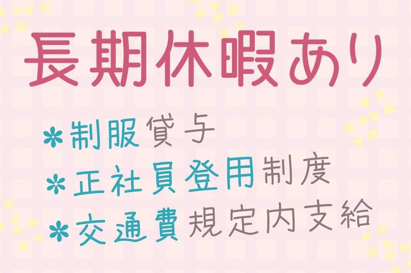 【保険制度】 雇用保険、労災保険、健康保険、厚生年金 待遇・福利厚生 【福利厚生】 *交通費規定内支給 *制服貸与(通勤時の服装自由) *正社員登用制度