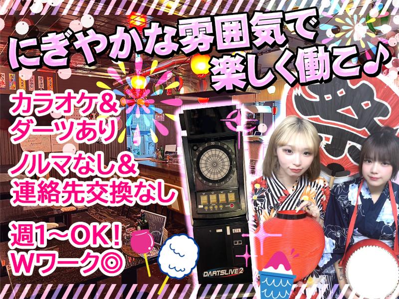 仕事内容: カウンターでお客さまと楽しくお話ししたり、簡単なドリンクを作るだけのシンプルなお仕事です。 カラオケやダーツ、わたあめなどの「お祭り」を意識したにぎやかな雰囲気の中で、 楽しみながら接客ができます。 お酒が飲めなくてもOKで、ノルマや連絡先交換もありません。 初めての方でもすぐに慣れて、気軽にスタートできます。 ■服装 浴衣貸し出し ネイル・ピアス・派手髪OK