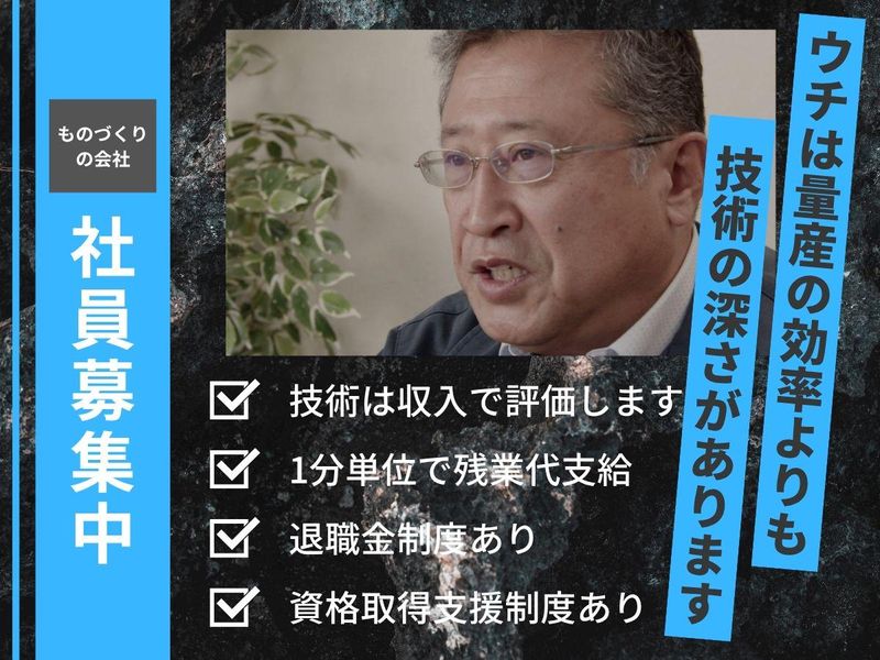 職場環境 当社は多品種少量生産を得意とした製造業で、機械・AIに負けない技術力があります。 賞与は年2回あり、完全週休二日制も可能です。 将来は工場長・幹部候補として活躍していただくことも可能です。