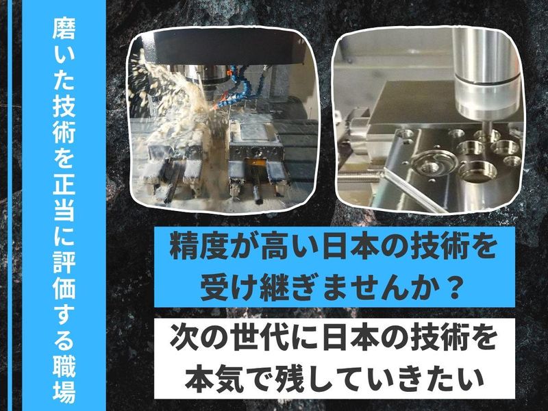求めている人材 ■対象となる方 未経験者OK 無資格OK 【経験あれば尚可】 ・汎用フライス、汎用旋盤、マシニングセンター、NC旋盤いずれかの加工経験 ■こんな方におすすめ □未経験から製造業にチャレンジしたい □安定企業で正社員として働きたい □手に職をつけたい □コツコツ作業が好き □ものづくりが好き・興味がある