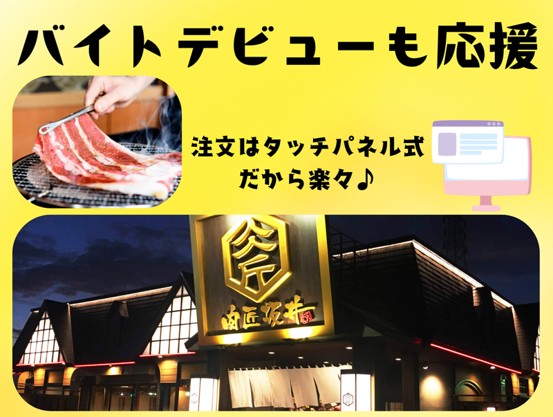 仕事内容 ・――――――――・・――――――――・ 国産牛食べ放題の人気焼き肉店 『肉匠坂井 枚方店』 <枚方市長尾谷町/マイカー通勤OK> ・――――――――・・――――――――・ | 週3日以上、1日3H~OK! | 週末のみ勤務も歓迎! | 時給1180円~ | 扶養控除内勤務可/副業・WワークOK | 制服あり/正社員登用制度あり ・――――――――・・――――――――・ *『肉匠坂井 枚方店』とは?* ━━━━━━━━━━━━ 当店は、国産牛を心ゆくまで 楽しめる食べ放題焼き肉店。 注文はタッチパネル式で、接客もスムーズ。 学生さんからファミリーまで幅広い お客様に愛される人気店です。 「また来たい!」と思っていただける お店づくりを目指し、 スタッフみんなで協力しながら 働いています。 *仕事内容* ━━━━━━━ 具体的な内容・・・ <<ホール業務>> *お席へのご案内 *オーダーテイク(タッチパネル補助) *料理の提供/ドリンク・ デザートの配膳 *お会計・お見送り *テーブルセッティング・ 片付け・清掃 注文はモバイルオーダー&QRコード 決済対応なので、レジ業務の負担も 少なく、スタッフからも 「働きやすい」と好評です。 マニュアルも完備しているので 未経験でも安心。コツコツ& もくもく作業が好きな方にも ぴったりです。 未経験でも丁寧にサポートしますので 安心してスタートできます。 *働きやすさ抜群!助け合いの風土* ━━━━━━━━━━━━━━━━━ 学生さん、主婦(夫)さん、 フリーターさん、Wワーク希望の方まで 幅広く歓迎! 子育て中の方も安心。急なお休みも 助け合える環境です。 勤務開始日は相談可能。学歴不問・ 男女不問。 *魅力的なポイントをご紹介* ━━━━━━━━━━━━━━━━ ◎<あなたの働き方を最優先> 1日4時間以内の短時間勤務もOK! 週末だけの勤務も可能で、 プライベートと両立できます。 ◎<待遇充実> 交通費支給(規定あり)、 制服あり、まかない補助あり。 正社員登用制度もあり、 長期的なキャリアアップも 目指せます。