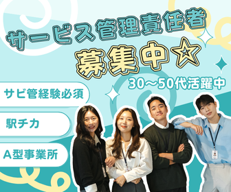 求めている人材 【必須条件】 サービス管理責任者資格 普通自動車免許 ※A型事業所が未経験でも可◎ ※ブランクのある方でも相談可◎ ※まずはお話だけでも大歓迎です