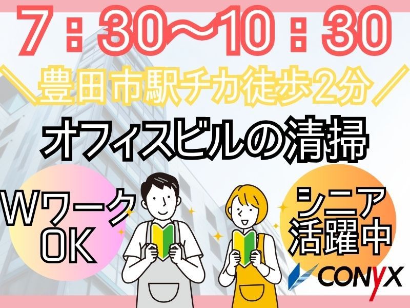 【仕事内容】 ⭕7:30~10:30の勤務、朝活にピッタリ! ⭕平日週5日、土日祝休み ⭕未経験OK ⭕扶養内OK \豊田市駅チカ徒歩2分!/ 豊田市にあるきれいなオフィスビルの清掃スタッフを募集中! 【主な仕事内容】 ✅オフィスビルの清掃作業(ビル内の共用廊下、階段、トイレなど) 難しい作業、機械の操作はありません! 未経験の方もスタートしやすいシンプルな清掃作業です♪ ===================== 充実したサポートが自慢です ===================== 創業70年以上のコニックスだからこそ、 働くスタッフへのフォロー体制は抜群です! ⭐覚えられるまで丁寧にしっかりとサポート! ⭐必要時には担当スタッフがすぐにフォロー! ⭐お休みも取りやすい環境です! まずはご相談からでも、お気軽にご応募ください! 【求人ID-CRN10A】