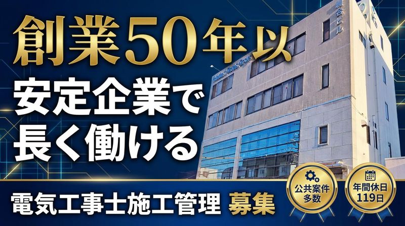 求めている人材 □学歴不問 必須条件 □普通自動車免許(AT可) いずれか該当する方歓迎 □電気工事の実務経験者 □施工管理の実務経験者 □第2種電気工事士 □2級/1級 電気工事施工管理技士 歓迎資格・経験 ・監理技術者(電気) ・官公庁・公共工事の経験 こんな方に向いています ・経験を活かして安定企業で長く働きたい ・地域インフラを支える仕事に誇りを持ちたい ・家族やプライベートも大切にしたい ・手に職つけたい・資格をさらに伸ばしたい