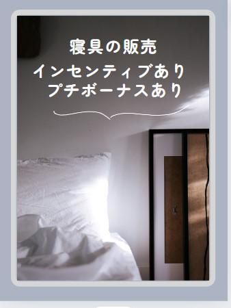 仕事内容 \百貨店にて寝具の販売/ 〇千葉駅徒歩1分、駅チカ好立地 【千葉そごう】での勤務。 〇生活に寄り添う寝具の販売 仕事の中で生活に活かせるスキルが身に付きます! ======================== 【お仕事内容】 〇心地良いマットレスと枕を中心に寝具の接客販売。 質が良いので接客しやすさもオススメです! 知識はやりながら覚えていけばOKです。 *百貨店での勤務になるので、落ち着いた接客ができます。 生活に寄り添う商品の販売になるのでお客様から感謝される事も多いです。 やりがいを多く感じながら自身のスキルアップにも繋がります! ======================== 【オススメポイント】 *インセンティブあり 販売に珍しい高額インセンティブあり! 頑張った分しっかりとインセンティブで支給されます。 *制服支給あり 制服支給があるので 毎日『何着よう』『百貨店だからお洒落しないと』等悩まずOKです!^^ ======================== 【ブランド紹介】 「良い睡眠は、良い人生につながる」 をコンセプトに、 真にリラックスできる睡眠の為に作られた寝具ブランド。 〇取り扱い ・マットレス ・ベッド ・枕 ・布団