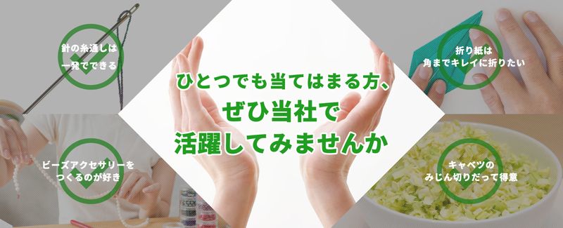 必要資格・経験 <必須なのは普通自動車免許(AT限定可)だけ> \スタッフの100%が未経験出身です/ |こんな方なら大歓迎| ・失敗から学び、改善を実現した経験をお持ちの方 ・積極的にチームメンバーに挨拶できる方 ・社内外の関係者との調整業務の経験がある方 ・急な仕様変更に対応した経験をお持ちの方 ・丁寧にじっくり物事に取り組める方 ・細かい作業が好きな方 └たとえば◎ ✓針の糸通しは一発だ ✓折り紙は昔から得意 ✓キャベツのみじん切りだって任せて! ⇒そんな方は、きっと当社で活躍できます。 お気軽に面接へお越しください!