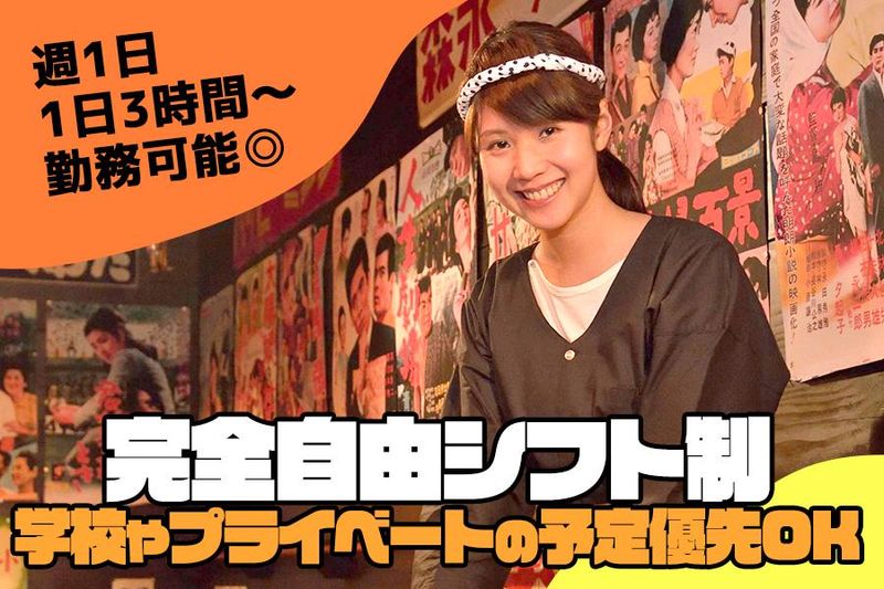 勤務時間詳細 【勤務時間】15:00~翌01:00 ※ラストの場合は1時間程度の閉め作業あり 上記時間から ◆週1,2日~OK ◆1日3h~OK ◆希望シフト制 ◆終電までOK ◆平日/土日のみOK ◆友達同士のシフトOK ◆扶養内勤務OK ご自身の予定に合わせて 希望のシフトを申請していただけます! 「部活と両立したい」 「この週はテストだから少なめが良い」 「レギュラー勤務でガッツリ入りたい」 などなど、 急なシフト調整も含めていつでも柔軟に対応♪ ご希望は最大限考慮して シフト組みを行うのでご安心下さい! - 【営業時間】 日~木 17:00~翌01:00 金・土 17:00~翌02:00