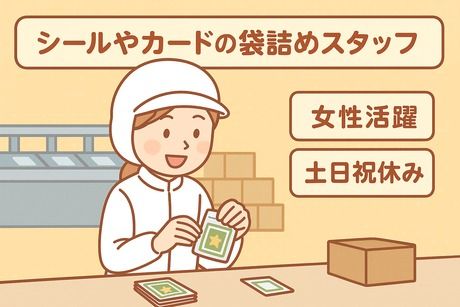 仕事内容 【仕事内容】 \お菓子のシールやカードを仕分け・封入するお仕事♪/ 誰もが知ってる人気お菓子に付いている ミニシール・カードを扱います! コツコツ進めるお仕事です♪ ★お仕事内容★ シールを箱から取り出してラインに流す 袋にシールを入れる お菓子やパンにつけて箱に入れる 重いものはありません! ★働きやすさバツグン★ 20代~40代の女性スタッフ活躍中! 土日祝休み&大型連休あり 残業なし!プライベートも充実 車通勤OK 空調完備で快適環境♪ 【アピールポイント】 20代~40代女性活躍 土日祝休み 大型連休あり 残業なし 車通勤OK 空調完備 【勤務地の補足】 埼玉県さいたま市岩槻区加倉