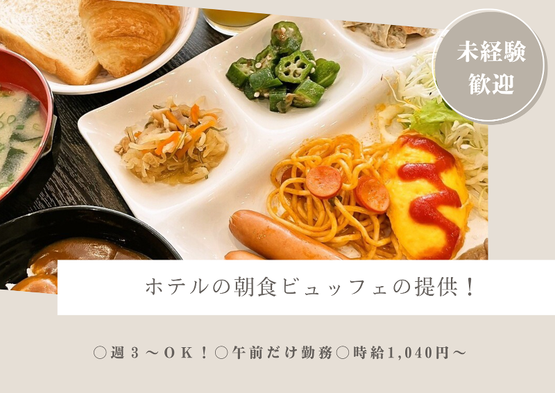 仕事内容: 【ここに注目!】 ・ホテルの朝食ビュッフェの提供! ・むずかしい作業はありません ・午前だけ勤務で生活リズムも整う◎ ・午後はゆったり自分時間が確保できます! ・勤務日希望提出OK ・扶養内勤務OK 【仕事内容】 琴平パークホテルでの、 ホテルで提供するビュッフェ形式の朝食について、 準備から提供、片付けまでを担当するお仕事です。 <具体的な仕事内容> 【準備業務】 ・ご飯の炊飯 ・お味噌汁調理 ・調理済み食材の温め ・野菜カット(キャベツ) ・盛付・セッティングおよび補充 ※調理はお味噌汁のみなので、 調理の仕事をしたことがない、 という方でも大丈夫! ※ご家庭でお食事をつくられる方であれば すぐに慣れて活躍できます! 【レストランホール業務】 ・席へのご案内 ・食器の片付け ・その他のお客様対応 【片付け業務】 ・食器の洗浄、片付け ※業務用の食洗機を利用しています。 <仕事のQ&A> [Q]調理場は寒いイメージだけど……? キッチンはレストランに併設されており、 年間を通して快適に過ごせる温度に設定されています。 食器洗浄の際は手袋を着用し、 食洗機を使用するため、 「水仕事がつらい」「手が荒れる」という心配もありません。 [Q]大変なことはある? 作業内容自体に難しいことはありません。 レストランのオープン時間までに 食事を準備する必要がありますが、 テキパキと次の行動を考えながら動ける方なら、 数ヶ月程度で手順を覚え、活躍していただけると思います。 [Q]やりがいは? 「料理の提供」と「お客様対応」 それぞれにやりがいがあるのが、 この仕事の特徴です。 レストランを利用されるお客様に、 朝食を心地よい時間として過ごしていただけるよう、 おもてなしの気持ちを持って行動することで、 お客様の旅の思い出作りをサポートする大切な役割を担っています。 【入社後の流れ・教育制度】 >> まずは料理提供の業務からスタート! 業務手順や、素早くできるコツを しっかりと伝えていきます。 難しい作業はありませんし、 慣れるまでしっかりと フォローするので安心してご応募ください。 慣れたら、レストランホールでの 業務に進めていきます。 こちらもしっかりとフォローしているので、 少しずつ身につけていきましょう。 【職場の雰囲気】 >> 女性が活躍中! ホテル全体で、 30代40代50代の女性が活躍している職場です! 長く働いているスタッフも多く、 やりがいを感じながらできるおもてなしのお仕事です。