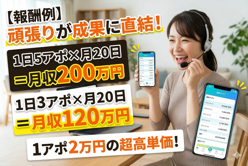 仕事内容 \ 1アポで2万円の超高報酬 / \ 1日10万円超も可能な超高単価案件 / デイサービス事業所へお電話し、 商談のアポイントを取得するお仕事です。 (業務効率化・コスト削減に繋がるSaaSサービスをご案内) ✼┈┈┈┈┈┈┈ここがPoint┈┈┈┈┈┈┈✼ ✅ 1アポ2万円!在宅ワーク最高級の単価 ✅ 平均獲得件数:1日3件・1日5件超えのスタッフも続出 ✅ 「2時間に1件」ペースで獲得できる好案件 ✅ 法改正タイミングで需要急増中!拒絶が少なく話が通りやすい ✅ リスト・トークスクリプト完備で即開始 ✅ 稼働時間は完全自由! ✼┈┈┈┈┈┈┈┈┈┈┈┈┈┈┈┈┈┈┈✼ 【 具体的な業務内容 】 ・デイサービス事業所への発信業務(テレアポ) ・サービス内容の簡単なご紹介 ・担当者様との商談アポイント取得 ・専用ツールへの履歴入力 ✼┈┈┈┈┈┈┈┈┈┈┈┈┈┈┈┈┈┈┈✼ 【報酬形態】完全成果報酬制 1アポ獲得につき:20,000円 ノルマ、稼働ノルマ一切なし! 頑張った分がそのまま収入に直結 <報酬例> ・1日5アポ×月20日 = 月収200万円 ・1日3アポ×月20日 = 月収120万円 ・週3日・1日3アポ = 月収72万円 ・副業で週2日・1日2アポ = 月収32万円 ✼┈┈┈┈┈┈┈┈┈┈┈┈┈┈┈┈┈┈┈✼ 《WEB応募なら24時間OK・1分で完了》 ご応募いただきましたら、担当よりオンライン面談の日程調整メールをお送りします。 面接は1回(オンライン)でOK! 最短翌日からの稼働も可能です。 「まずは詳しく聞きたい」という方もお気軽にご応募ください!