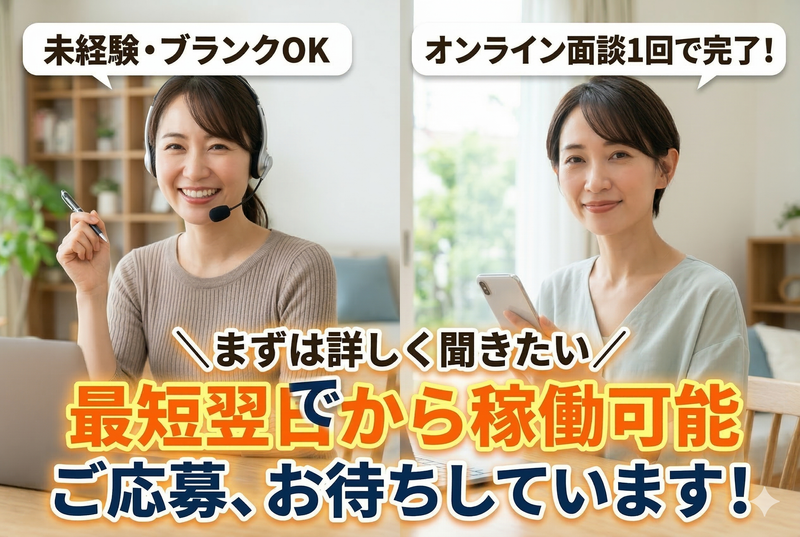 選考プロセス 《WEB応募なら24時間OK・1分で完了》 Web応募はたった「1分」で完了! ご応募いただきましたら、担当より オンライン面談の日程調整メールを お送りします。 面接は1回(オンライン)でOK! 最短翌日からの稼働も可能です! 「まずは詳しく聞きたい」という方も お気軽にご応募ください!