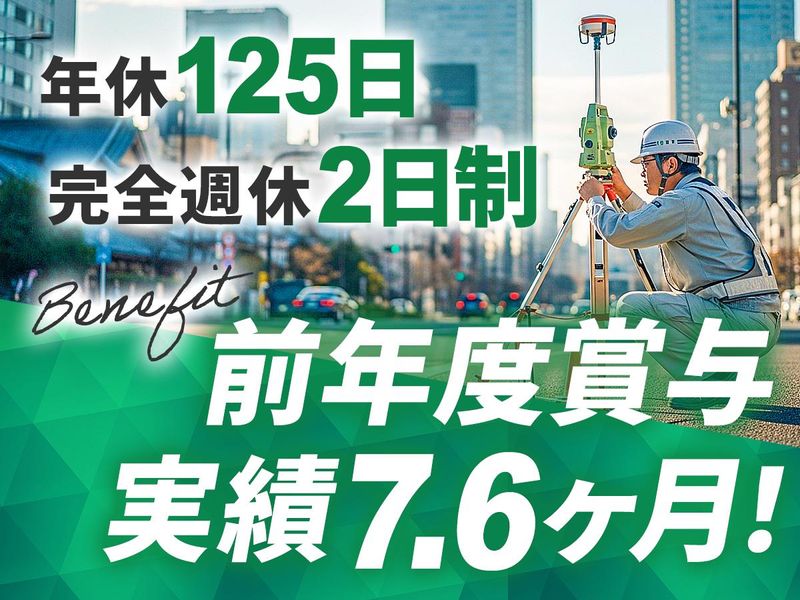 仕事内容 当社は昭和26年創業時より民間開発や官公庁事業において、世界を舞台に様々な測量を手がけております! 「測量士」は、建設工事や都市開発などで不可欠なお仕事であり、将来のために"手に職”をつけたい方にぴったりです◎ 当社なら働きながら国家資格取得が目指せます! ✅ 未経験歓迎♪ ✅ 国家資格取得可能!(会社負担) ✅ 測量士資格保有者は月30万〜! ✅ 前年度賞与実績7.6ヶ月! ✅ 年休125日以上 ✅ 完全週休二日制 ✅ 残業ほぼなし ✅ 手当充実 ✅ 再雇用制度あり(給与据え置き◎) ✅ 退職金制度(勤続3年以上) ✅ 作業着貸与 ✅ 社用車貸与×直行直帰OK! ✅ 保養所あり(草津♪) ✅ えるぼし認定企業 <主な仕事内容> 土地の位置、形状、面積などを測量計画に基づいて正確に測定し、その結果を基に図面作成や地図作成を行う仕事です。 ・基準点測量 ・用地測量 ・地形測量 ・地籍測量 ・写真測量 など *現場は1日1〜3件程度 *重量物がないため身体的負担なし *週に1日は社内で事務作業(図面作成等)に専念する日を設けているため、残業に追われる心配なし◎ \\ ✨ CHECK POINT ✨// ◆ 再雇用制度あり!100歳まで働ける! 人生100年時代!給与据え置きのまま、再雇用制度で働き続けることが可能です! 50〜60代の方でも年齢関係なく長期キャリアが築けます♪ ◆ 年休125日以上!残業ほぼなし 毎年安定した売上があるからこそ、無理な残業は不要。18時にはほとんどの社員が退勤しています◎ 完全週休二日制で、個々のライフスタイルに合わせた働き方が可能です。 ◆ 賞与実績7.6ヶ月&退職金制度♪ 賞与は業界最高水準!頑張りは必ず給与に反映するので、未経験で入ってもすぐに高収入が目指せます!退職金制度があるから将来設計もしやすく、腰を据えて安心して働けます。 ◆ かわさき☆えるぼし認定企業 当社は、女性の活躍推進やライフワークバランスの推進に積極的に取り組んでおり、残業時間削減の徹底や、産休・育休の取得等、プライベートと両立できる働き方を提供しています♪ ◆女性測量士も活躍中♪ 測量は男性の仕事というイメージが強いかもしれませんが、当社では女性の測量士さんも活躍しています! 産休・育休の取得推進等、家庭と両立できる環境を整えているため、安心してご応募ください♪