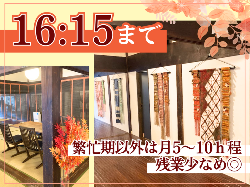 勤務時間詳細 総労働時間:1週あたり39時間 9:00~16:15 (実働6時間30分・休憩45分) 【平均残業時間】 閑散期:5~10時間 繁忙期(11月):45時間 ✔残業代は全額別途支給 ★11月は香嵐渓の紅葉シーズンのため 少し忙しくなりますが、 あなたの料理が多くの方に届く やりがいを感じられる時期でもあります。