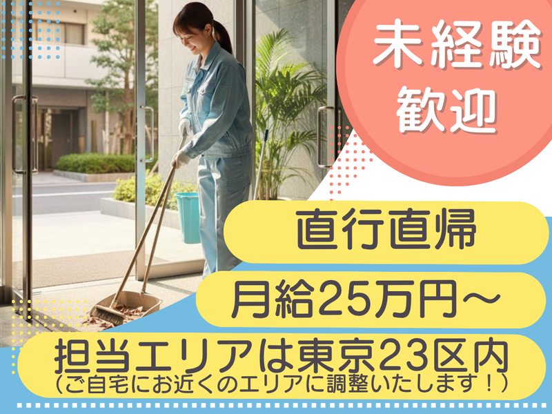仕事内容 「早起きさんにうれしい働き方。」 午前中に働いて、14時にはお仕事終了。 そんな働き方、アリです。 ✨20代・30代活躍中! ✨モクモクコツコツ作業 ✨エレベーター付きで安心♪ マンション巡回清掃のお仕事をお任せ! °˖✧ …………………………………… ✧˖° ⭐ 具体的なお仕事内容 ⭐  ̄ ̄ ̄ ̄ ̄ ̄ ̄ ̄ ̄ ̄ ̄ ̄ ̄ ̄ 数件のマンションを巡回し、各マンションで 以下の作業を行っていただきます。 ✅建物内共用部の掃除 ✅ゴミ出し、ゴミ置場の清掃 ✅敷地内のゴミ拾いや草取り など。1件あたり1時間~3時間程度です! 特別なスキルは一切必要ありません♪ ⭐ 勤務地について ⭐  ̄ ̄ ̄ ̄ ̄ ̄ ̄ ̄ ̄ ̄ ̄ ̄ 基本的に23区内のマンション清掃ですが 担当する現場は、自宅から近いエリアです。 最初は先輩と一緒に業務を進めますので ご安心くださいね。 ※最初は「電車・自転車・徒歩」での 巡回をお願いしていますが、 将来的にはバイクや車での通勤も できるよう検討しています。 °˖✧ …………………………………… ✧˖° ⭐ とある1日の流れ ⭐  ̄ ̄ ̄ ̄ ̄ ̄ ̄ ̄ ̄ ̄ ̄ ̄ ̄ ⏩ 5:00 1件目の「物件A」に到着! ゴミ出し作業 ↓ 2件目の「物件B」でゴミ出し ↓ 3件目の「物件C」でゴミ出し ⏩ 8:00 「物件C」の清掃 ┗エントランス、外回りの清掃 各階フロア、階段を綺麗に♪ 終わったら次の物件へ♪ ⏩10:00 休憩(1時間) ⏩11:00 「物件B」の清掃~移動 ⏩13:00 「物件A」の清掃 ⏩14:00 終了!直帰 ✨基本はルーティーン業務です! モクモク&一人作業なので裁量も大きく、 スケジュール管理も自由にできます♪ ✨使用する掃除用具も、各現場に完備して いますので、持参物もほぼありません! °˖✧ …………………………………… ✧˖° ⭐ スタッフの声 ⭐  ̄ ̄ ̄ ̄ ̄ ̄ ̄ ̄ ̄ ̄ ̄ Aさん「朝は早いですが自分のペースで ひとり作業できるところが 自分に合っていて心地よいです!」 Bさん「家でじっとしているより、 適度に体を動かせるのが 気持ちがいい!」 ✨有給も取りやすく、それぞれの 生活にあった働き方ができました! °˖✧ …………………………………… ✧˖° ドライバー、新聞配達、警備員などなど 異業種から始めた未経験の方も多いです♪ また、「早朝からの仕事の経験者」や 「朝から活動したい方」が活躍中! 少しでもご興味ありましたら 是非ご応募ください! \\\ 電話応募も大歓迎 /// ☎ 03-3424-1747 「採用担当」までお待ちしております!