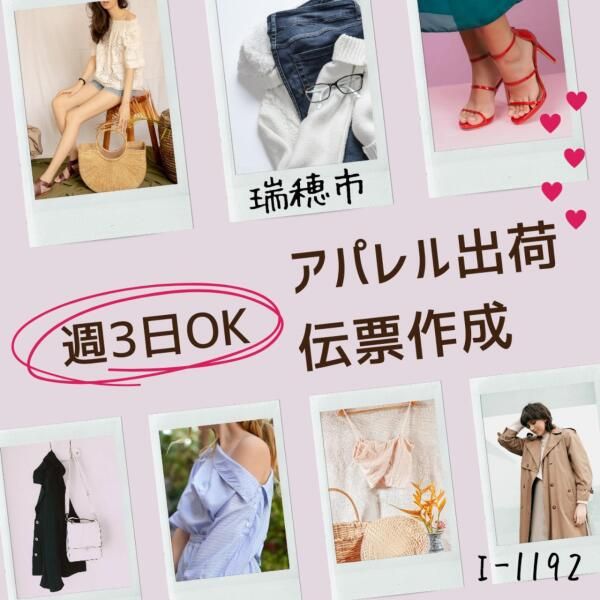 仕事内容 ★週3日OK!午後から短時間勤務★ アパレル商品の出荷・伝票作成♪ 《仕事内容》 アパレル倉庫で、PCを使用した伝票作成や、 商品のピッキング・出荷をお任せします。 事務作業1割、出荷作業2割の割合です ・月曜~金曜の間で、週3~4日勤務可能な方歓迎 ・繁忙期には土曜勤務あり ・扶養内での勤務可能 ・勤務曜日は相談OK ・土日祝休み(繁忙期の土曜出勤あり)