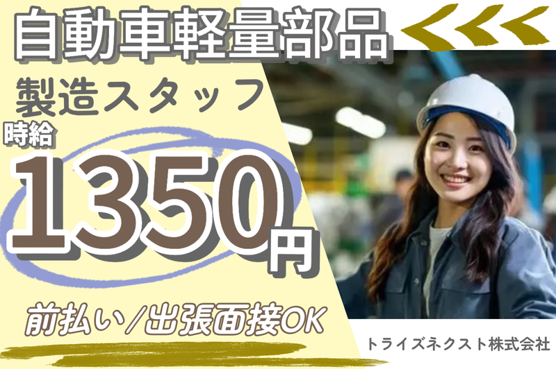 ■仕事内容 自動車外装部品のバリ取り・組付け・検査作業です。 成型機から片手で持てる部品が流れてきますので、 クリップ等の部品を取り付けし、目視検査をしたら、箱に詰めるだけです。 ※速度もゆっくり流れてきますのでバタバタする事はありません。 ■仕事の特徴 車通勤OK バイク通勤OK 髪型・髪色自由 友達と応募OK 即日勤務OK フルタイム歓迎 長期歓迎 シフト制 学歴不問 未経験・初心者OK ブランクOK 資格不問