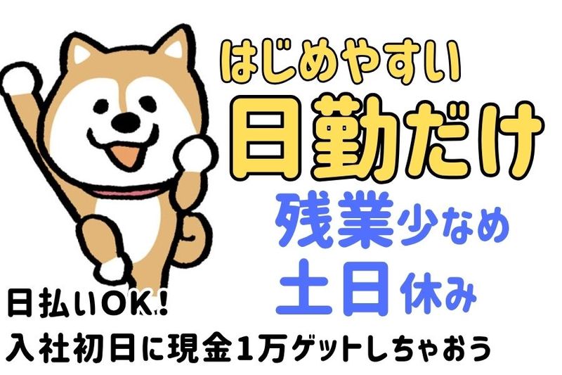 アピールポイント: /\/\/\/\/\/\/\/\/\ 入社時の特別支給「サクッと1万」開始 \/\/\/\/\/\/\/\/\/ 入社初日に「入社特典」をゲットしよう! 配属されたその場で「現金1万円!」 気になったらお気軽にお問い合わせください! 資格+経験を活かしてモデル月収29万円~ 研修ありなので安心してお仕事スタートできます * 日勤専属×残業少なめ * 食堂/ロッカー/喫煙所あり * 制服貸与あり * 土日お休み * 夏季/年末年始/GW 休暇あり * 男性スタッフ中心に活躍中! * ミドル世代の転職におすすめ <日払い・週払い利用OK> \まるで毎日が給料日/ \\利用者急増中// \アプリで簡単申請/ お気軽にご相談くださいね!