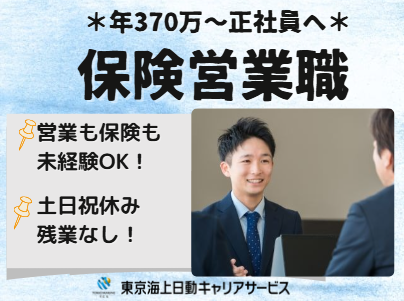 仕事の内容 \未経験から保険営業へキャリアUP/ ◆年収375万以上!やりがいシッカリ ◆土日祝休み&毎日17:45定時帰り ◆社会人経験浅い方もコミュスキいかして成長できる職場です 【基本情報】 雇用形態:紹介予定派遣(正社員) 雇用期間:長期(3カ月以上) 就業時間:8:45~17:45(休憩60分) 【必須条件】 ◆顧客対応経験 └PCスキルは問いません! ◆自動車普通免許 【お仕事内容】 ・社有車で既存顧客を中心に訪問 ↓ ・契約更新、保険のご提案などアフターフォロー ※営業エリア:富里、成田を中心 ※既存顧客が9割なので新規開拓に抵抗ある方も馴染みやすい環境です 【こんな方にオススメ】 お客様と話したり信頼関係を築くことが好きな方 【正社員登用後の待遇】 ・年収:375万円~450万円程度 ・月給:25万円~30万円 ・昇給あり:年1回 ・賞与あり:年2回 ・業務災害補償保険 ・退職金あり ・定年60歳(65歳まで再雇用制度あり) ・転勤なし 【環境面等】 ・@成田駅/最寄り駅から徒歩10分 └市役所や大型ショッピングモール近くの便利な立地! ・お客様はもちろん働くスタッフも大切にする保険代理店 ・ アットホームで風通しの良い雰囲気◎ ・家事や育児をしながらでも安心して働ける職場 ・未経験活躍中/ブランク活躍中! └わからないことは先輩に質問、確認しながら成長できる環境です ・オフィスカジュアル内で服装自由 【福利厚生等】 ・清潔感のあるオフィス空間 ・社会保険完備 ・定期健康診断あり ・車通勤OK(駐車場はご自身で手配いただきます) ・禁煙オフィス!煙苦手な方も安心 ・平日のみOK!土日祝休み ・年間休日125日以上&お休み相談可 └有給休暇、年末年始休暇、夏季休暇など ○●嬉しいPOINTたくさん!●○ 直接雇用前提/転勤なし/U・Iターン歓迎/賞与あり/昇給あり/退職金あり/月収例25万円以上/残業なし