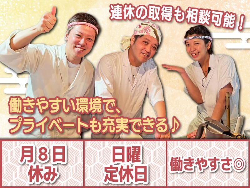 休日休暇 *月8日休み(日曜定休+他/土日・日月休みなど連休取得も可) >日曜日が祝日の場合は翌月曜休み >完全週休2日や月9日・10日休みなど働き方は相談に応じます >勤務形態により、給与体系に変動はあり *有給休暇あり >お子様の学校行事やご家族、パートナーの誕生日や記念日にも取得するスタッフも多数 >有給休暇はもちろん普段のシフトにおいても家庭の都合でのお休み調整がしやすいです *夏季休暇・年末年始休暇 *年末年始休暇詳細:12月31日~1月3日+12月30日・1月4日公休/計6連休 >上記の年末年始休暇スケジュール・休暇日数は2024年度実績です *産前・産後休暇 *慶弔休暇・育児介護休暇 *特別休暇(結婚休暇等) <労働環境が整っている働きやすい環境です> 毎月8日しっかりと休めるのはもちろん、 有給休暇や長期休暇、各種休暇制度など労働環境を整えています。 地鶏はバラした状態で仕入れるなど日々の業務効率を重視し、 負担の削減を行うことで料理やサービスのクオリティを下げず、働きやすさの改善に取り組んでいます。 今後も働きやすい環境を整え、スタッフの定着率向上及び採用を強化し、 更なる既存店の体制強化及び新店舗拡大を目指したいと考えています。