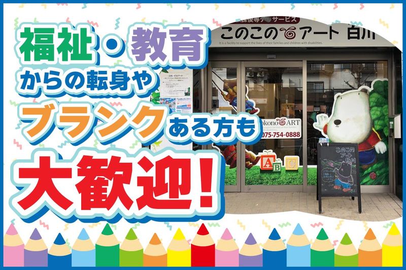 仕事内容 『今からでも、誰かの役に立ちたい』 そんな思いをカタチにしてみませんか! ⭐異業種・異職種からのチャレンジ歓迎⭐ ⭐40代・50代で始めた方も活躍中!⭐ ⭐丁寧なOJTやサポート体制完備⭐ ⭐資格取得支援制度あり!費用負担なし⭐ ⭐基本残業なし、年間休日120日以上⭐ * * * * * * * * 未経験から福祉の仕事に チャレンジしてみませんか? 京都市左京区に位置する アート特化型の放課後デイサービスで 新しい仲間を大募集! 職種未経験の方も大歓迎です! 社会貢献を実感しながら働ける やりがいのあるお仕事です。 入社後は先輩スタッフが丁寧に指導し、 資格取得も全力でサポート! ここから新しいキャリアを スタートしましょう! ◆─── - - - 仕事内容 - - - ───◆ アート特化型の放課後デイサービス 「このこのアート」にて、 さまざまな形で児童の発達を サポートする児童指導員として 活躍してください! ■具体的には… 当施設は、障がいを持つ 小学生~高校生を対象に、 放課後や長期休暇中に開講しています。 児童指導員として 以下の業務をお任せします。 *児童の出欠確認 *児童と一緒にアート活動や 工作・音楽活動を通して遊ぶ *活動内容の記録& 保護者への連絡帳記載 *児童の送迎 *定期イベントの運営 *朝礼・終礼・ミーティング ~~ 活動例 ~~ ・楽器を弾いて【 演奏会 】 ・みんなで【 お絵描き 】【 書道 】 ・段ボールを使った【 工作 】 ・季節を感じる【 和・洋菓子作り 】 ・好きな【 絵本を読む 】 ・【 リトミック 】で身体を動かす ・【 レクリエーション 】etc. こうした活動を通して、 子どもたちの好きなこと、 興味のあること、得意なことを見出し、 【 自己表現力 】を養うことで 【 自己肯定感 】を高める支援を 行っています。 子どもたちの作品は個展や展覧会などで 多くの方に見ていただいています。 過去には、「京都市長賞」を 3年連続で受賞したことも! 表彰されて喜ぶ児童の姿や 誇らしい親御さんの姿に感動♪ やりがいはバッチリです! HPもぜひご覧ください! 活動報告も掲載中♪ https://macom-p.com/welfare …………………………………………… 育 成 前 提 の 採 用 で す …………………………………………… 今回の募集は未経験の方も大歓迎! イチから育てる前提の採用です。 丁寧なOJTやサポート体制も しっかり整えていますので 大船に乗ったつもりで チャレンジしていただけます! 実際、40代~50代で 未経験からスタートしたスタッフも 多数活躍していますよ◎ ⭐例1:報連相がスムーズな職場! 悩みや疑問はその日のうちに 解決できるよう、毎朝・毎晩の ミーティングを実施しています。 何でも気軽に相談してくださいね。 ⭐例2:グループ全体での交流も活発! 成功事例や効果的な取り組みを グループ内で共有し、 日々の施設運営に活かしています。 スタッフ同士のつながりも強く、 いつでもコミュニケーションが 取りやすい環境です。 …………………………………………… 働 き な が ら 資 格 取 得 で き る …………………………………………… 資格取得支援制度を設けており、 「もっとスキルアップしたい」という 意欲ある方をバックアップしています。 もちろん費用は全額会社負担! ほかにも、外部セミナーへの参加費用を 会社が負担するなど 学びを広くサポートします。 (資格例) ・強度行動障害支援者養成研修 ・児童発達支援管理責任者 など 例えば、「児童発達支援管理責任者」は 障害のある子どもの発達に応じて 個別支援計画を作成したり、 家族支援を行ったりする仕事です。 この研修を受けるためには 「実務経験」と「研修の修了」が必要。 資格取得条件を満たした方は、 勤務時間内で資格取得が可能です。 …………………………………………… ス タ ッ フ イ ン タ ビ ュ ー …………………………………………… ▼Aさん、男性、40歳、元営業職 これまでは自分のために 仕事を頑張ってきたのですが、次第に 「社会貢献を実感できる仕事をしたい」と 思うように。 初めてのことで不安や緊張もありましたが 年齢を考えたときに「今しかない」 「今からでも、誰かの役に立ちたい」と 思って転職を決意しました。 全くの未経験スタートなので 資格はもちろん、福祉現場の知識もなし。 それでも、丁寧なOJTのおかげで しっかり成長できています。 何かあればすぐ質問・相談できますし、 当日中に解消できるので安心です。 同年代で同じく未経験入社の方がいたのも 自信になりましたね。 残業も基本ないですし、休みも豊富なので ワークライフバランスも抜群です。 今は資格取得を目指して日々奮闘中! 子どもたちを支えながら、私自身も 成長させてもらっています。 …………………………………………… サポートスタッフのお仕事って? …………………………………………… 障害を持つ子どもたちが、 “自分自身の好きなこと”を 見つけるサポートを行うお仕事です。 一人ひとりの「好きなこと」 「興味があること」「得意なこと」を 見つけ、楽し