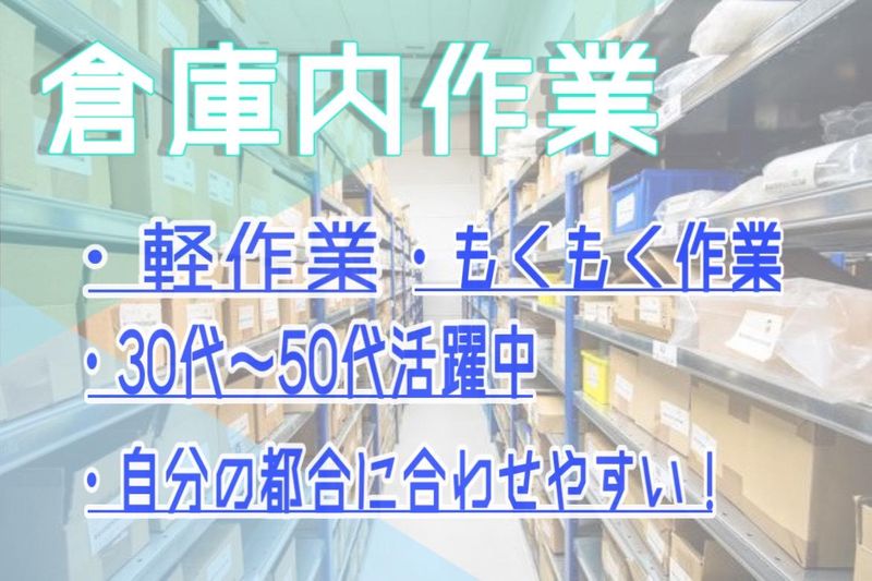 仕事内容 商品の仕分け・ピッキング作業などの作業をお願いします! 簡単でシンプルな立ち作業です! お客様とのやり取りのない倉庫内作業なので 「コツコツ」「もくもく」自分のペースで集中 してお仕事がしたい方にオススメ♪ 30代、40代、50代活躍中☆