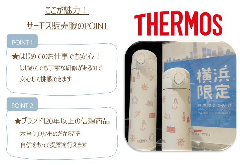 仕事内容 ~~~~~~~~~~~~~~~~~~~~ ★品質重視の安心ブランド ★高時給1360円~&交通費全額 ★未経験歓迎!イチから丁寧に教えます ~~~~~~~~~~~~~~~~~~~~ 【仕事内容】 水筒やタンブラーで大人気な キッチン雑貨ブランド <THERMOS>での接客販売 サーモスの魅力を伝えていただける サーモス商品のコンシェルジュを積極募集中 “ 次の心地よいをつくる。” サーモスではお客様の ライフスタイルに寄り添った商品を ご提案しています。 お客様との会話を大切にした 接客スタイルだからこそ やりがいや働きがいは◎! 【 具体的には・・・ 】 ◆商品説明、商品の補充、陳列 ◆プレゼント包装 ◆レジ業務 ◆オーダー商品の受付、交換 ◆店舗問合せ電話の対応 ◆店舗の簡単な清掃 など 【 取扱い商品 】 水筒、タンブラー、お弁当箱、 フライパンなどのキッチン雑貨から、 アパレル雑貨やアウトドア商品も取扱いあり! 【 ブランドについて 】 「魔法びん」のパイオニアであるサーモス。 1904年に世界で初めてガラス製魔法びんを製品化し、 1978年には日本の技術力をもって 「高真空ステンレス製魔法びん」を 生み出した世界最大の魔法びんブランドです。 【 下記エリアからもアクセス便利 】 桜木町駅・馬車道駅・横浜駅・高島駅・ 新高島駅・関内駅・日本大通り駅・ 藤沢駅・茅ヶ崎駅・菊名駅・戸塚駅 など \ オススメポイント / ●万全のフォロー体制あり 本社研修やトレーナー制でのレクチャーで イチから丁寧にお教えします! お仕事がはじめてのスタッフも 安心して働けますよ また、ブランドの魅力を伝えられるように、 まずはスタッフの皆さんにも サーモス商品の魅力を知ってもらうために 実際に商品をプレゼントしています♪ ●社会人としてのマナーが身に付きます 丁寧に研修を行うので はじめてのお仕事としてもおすすめの求人! 学生さんからは就職活動中に 役立ったとの声もいただいています◎