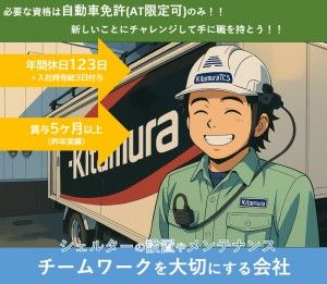 インフォメーション 必要な資格は自動車免許(AT限定可)のみ!!土日休み&夏・冬・GWは8日以上の連続休暇!! スマホキャッシュレス決済やSNS・・・ 日々の生活に欠かせない通信インフラを 守る社会に欠かせないお仕事です。 現在、”なくてはならない存在”となった インターネット等の通信環境。 通信インフラといってもはさまざまで、 日常生活で使うテレビやスマホ、 災害時などに使われる通信環境もその一つです。 そんな、私たちの日常生活に深く関わっている 通信インフラをシェルターと呼ばれる”ハコ”を 通して守っているのが当社。 インフラを守る仕事なので、経営基盤は常に安定。 今回は事業拡大に伴った増員募集です。 アピールポイント ●職場見学可(履歴書不要、服装自由) 職場や働いている方の雰囲気などを感じる ことができます 仕事内容もより具体的にお伝えできるので ミスマッチを防げますよ。 ●Uターン、Iターン、JターンOK 引っ越し費用の補助が出るので、新生活を スムーズに始めやすい! ●有給休暇が取りやすい環境 有給休暇取得計画表を作成しているので、 取得しやすい環境です ●働きやすい環境 工具は全て会社が用意。制服も貸与され、 交通費も支給。 各種手当もあるので腰を据えて長く働けます。