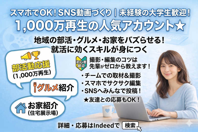 アピールポイント: ★応募条件 ・大学生・専門学生さん大歓迎! ・難しいスキルはいりません。**「スマホで動画を撮ったことがある」**なら合格です! ・友達と一緒に応募もOK! ★ここがおすすめ! ・バズるコツがわかる: 1,000万回再生された秘密を教えちゃいます。 ・履歴書に書ける: 「SNS運用の経験があります!」と言えるのは将来の強みに。