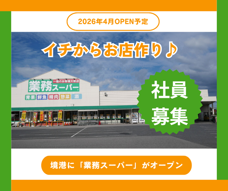 仕事内容 - 2026年4月 新規オープン予定 \ 話題の「業務スーパー」の正社員募集/ 鳥取県境港市に新規出店につき オープニングスタッフ大募集 >> 株式会社サンアイです << - ╭──────────────────╮ その経験とアイデア、 「自分の裁量」で活かしませんか? ╰──────────────────╯ ✅ 会社の看板じゃなく「あなたの力」で部門を動かす ✅ サービス残業禁止!働きやすさを大切にしたい方 ✅ 地元・鳥取で腰を据えて働きたいUIJターン歓迎 ✅ 未経験からでも、着実にステップアップできる環境 ✅ 週休2日でしっかり休める - “社員想い”の運営体制を強化中!- 株式会社サンアイでは、週休2日制を導入しています。 「しっかり休んで、しっかり働く」を大切に、スタッフのみなさんが安心して働ける環境を整えています。 また、社員・アルバイト・パートの垣根なくチームで協力し合える体制があるからこそ、 みんなが無理なく休みを取りながら、日々の仕事にしっかり向き合えています。 ╭──────────────────╮ <仕事概要> 地域へ「美味しい」を届ける ╰──────────────────╯ 株式会社サンアイは島根県安来市にて「業務スーパー」を運営しています。地域に根ざし、お客様に喜ばれる店づくりを目指しています。食料品を中心に、日々の生活に必要な商品を幅広く提供している会社です。 今回募集するのは、その中でも地域の食卓を支える業務スーパーのスタッフ。 実は、新しく境港市に「業務スーパー」をオープンする予定です! 新しいお店をイチから作り上げていく体験ができるチャンスです。 「地域のみなさんにどうやって浸透させていくか」 「お店を盛り上げるために、スタッフをどう巻き込もうか…」 「数ある業務スーパーの中で、この店舗をどんな「色」の店舗にしていくか」 大手スーパーとは違い、マニュアル通りの仕事だけではありません。自分のアイデアを活かし、仕入れから販売、売場づくりまでをお任せします。あなたの経験と知恵を最大限に発揮し、店舗全体を動かす大きなやりがいを感じられる仕事です。 ╭──────────────────╮ 具体的な業務内容 ╰──────────────────╯ レジ業務・フロア業務(商品陳列など)など 全般の業務を担当いただきます! ・レジ対応 ・果物や野菜の袋踏めや陳列 ・売り場レイアウト ・商品の品出し・売場づくり ・接客 ・パート・アルバイトスタッフの教育・管理 ・部門全体の売上や収支管理 ■店舗レイアウトや販促もあなた次第! SNSでも人気の「業務スーパー」の商品たち。ファンの方々がネット上で紹介してくれる情報も豊富にあります。 そうしたトレンドやお客さまの声をキャッチし、売場づくりやPOP作成に活かせるのもスタッフならではの楽しみ。 「どうしたらお客さまがもっとワクワクできるか?」 「どんな売場にしたら売上につながるか?」 その工夫やアイデアを、レイアウト・ディスプレイ・販促に反映してください。 店舗運営の裁量を大きく持てる環境で、 あなたの発想をどんどんカタチにしていきましょう! ╭──────────────────╮ ステップアップ設計 部門責任者として成長できる環境 ╰──────────────────╯ 入社後は、まず先輩スタッフと一緒に現場で一つひとつの業務を覚えていただきます。 レジや商品の袋詰、陳列など…当社のノウハウを丁寧に教えますのでご安心ください。 業務に慣れてきたら、少しずつ裁量をお渡ししていきます。 パートさんのシフト調整や教育、売上管理など部門全体を統括する役割を担っていただきます。 あなたの経験を存分に活かしながら、自分だけの売場、チームを作り上げてください。 もちろん、困った時はベテラン社員がしっかりサポートします。 ╭──────────────────╮ 「株式会社サンアイ」とは・・・? ╰──────────────────╯ 株式会社サンアイ(設立:1978年9月・資本金:5,000万円)は、鳥取県米子市に本社を置き、業務スーパーやホームセンター「サンアイ」として小売業を展開する地元密着の企業です。業務スーパーのフランチャイザーの展開及び青果や精肉、酒類、日用品などを幅広い取扱いの他、お弁当や惣菜の製造販売も手がけています。地域の生活を支える存在として、きめ細かい品揃えが魅力です。 <主な事業> ・業務スーパー ・ホームセンター サンアイ ・神戸物産【馳走菜】の惣菜・お弁当の製造販売 ・ドラックストアの店舗内にて、青果・精肉の販売