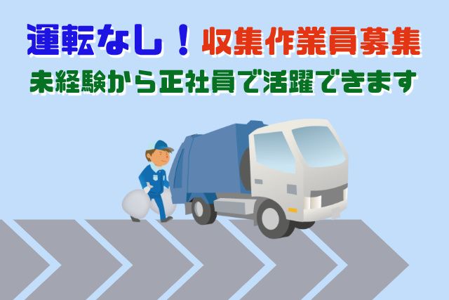 仕事内容 業績好調につき積極採用中! 収集ドライバー助手(正社員)募集! 未経験OK!運転免許は不要! 30代~50代迄幅広く未経験者が活躍しています! 勤務時間が「短め」でプライベートの時間を重視できるため、 メリハリをつけて仕事に取り組みたい方には是非ともおススメですよ。 ▼収集作業員のポイント▼ 〇運転なし 〇未経験の方も正社員になれます 〇賞与年2回 〇皆勤手当・精勤手当あり 〇中高年作業員活躍中 〇40代・50代も多数活躍中 【異業種からの転職者も多数】 前職料理人の方も現在活躍中 どんなお仕事でも 最初は「分からない」が当たり前です。 経験や資格は一切必要ありませんので 是非チャレンジをしてください 【収集作業員の勤務について】 月~水は8:30~17:00、木~土は8:30~16:00 ・週の前半の3日間は実働7.5時間 ・週の後半の3日間は実働6.5時間 時間短め、体力的にも働きやすいのがポイントです 【収集作業員の仕事について】 一般家庭ごみ又は産業廃棄物の収集作業員の募集です 運転手ではないので、パッカー車の運転はありません 資格や経験は一切必要ないので、やる気があればOK 従業員が仲が良く馴染みやすいのがポイント みんなイチからしっかり仕事を教えてくれます。 【働きながらキャリアを積んで給与UP可能】 作業員から運転手にステップアップも可能 運転手になると月給30万円以上も可能です! まずは収集作業員として活躍しませんか ご不明な点はお気軽にお問い合わせください。 お電話での応募も可能です。