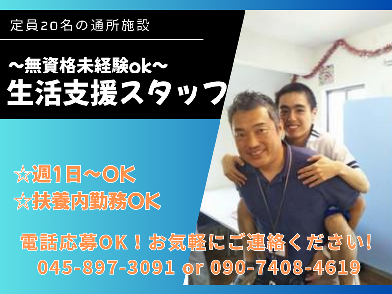 仕事内容 ✨新着求人✨ ◆働きやすさが魅力の支援スタッフ募集◆ ================ ✨未経験から始められるお仕事! ✨週1日~無理なくシフトOK! ✨お電話での応募も大歓迎! 【045-897-3091】または 【090-7408-4619】までお気軽に♪ ※営業電話はご遠慮ください ================ 【お仕事内容】 定員20名の障がい者通所施設で、 利用者様の生活を支えるサポート業務です。 ✅具体的には… ・朝の体操など簡単な運動の見守り ・販売用の軽作業サポート ・レクリエーションの企画・実施 どれも特別な経験は必要なく、 未経験の方でも安心して始められます。 【働きやすさのポイント】 ⏰週1日~勤務OK! ⏰短時間・扶養内勤務もご相談可能 ⏰副業・Wワークも歓迎 「本業の合間に少しだけ」 「育児や家庭と両立したい」 そんな方にピッタリです☘ 勤務日数や時間は柔軟に調整できるので、 ライフスタイルに合わせて無理なく続けられます。 【未経験でも安心】 丁寧にサポートする体制があるので、 はじめての方もすぐに慣れていただけます。 難しい作業はなく、シンプルなお仕事です。