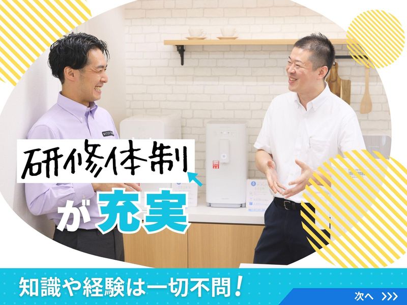 仕事内容 / 働き方の概念が変わる!? ストレスフリーで 自由な働き方を.・☆* \ . 業績好調!! 営業スタッフ増員募集♪ . ================= この求人のポイント♪ ================= ◆経験・スキル不問! <普通免許があればOK>です☆ ◆年間休日<120日以上!> ◆未経験も安心の<サポート体制完備♪> ◆<スーパーフレックス制>で 理想の働き方が実現♪ ◆ノルマはありません!! . . ================= 仕事内容はこちら! ================= . ✅サーバーメンテナンス  ̄ ̄ ̄ ̄ ̄ ̄ ̄ ̄ ̄ ̄ ̄ ̄ フィルター交換や作動チェックなど 既存のお客様先にて メンテナンスを行います! 1件40分ほどの時間が掛かるので お客様とのお話しを楽しみながら 作業をお願いします♪ 設置から修理まで、やり方は 研修でしっかりレクチャー! . ✅新規顧客対応  ̄ ̄ ̄ ̄ ̄ ̄ ̄ ̄ 電話やSNSからお問合せいただいた 新期のお客様先にて、 お客様の要望をヒアリングし 最適な機種のご案内を行います! . ✅設置・交換・撤去  ̄ ̄ ̄ ̄ ̄ ̄ ̄ ̄ ̄ ̄ ご契約されたお客様先にて ウォータースタンドの設置を行います! . もちろん、 社用車や制服 タブレットや携帯電話などの 業務に必要なものは貸与! . . 設置方法や お手入れ方法のご説明などは 入社後にしっかり研修を行うので どなたもご安心くださいね♪ . . ================= 安心の<サポート体制!> ================= ◆入社後、まずは座学研修で 商品知識や訪問マナーなどを 基礎から丁寧にレクチャーします! . ◆座学研修後は、OJT研修で 先輩に同行し実際の現場を 学んでいただきます! . ◆独り立ち後も 階層別の勉強会や研修を実施♪ . 更に・・ 週に一度、 上長との面談を設けています。 ◎実務上のトラブル解決方法 ◎アドバイス・フォロー などなど・・ 些細なことから 相談できる環境が整っています♪ 安心してご応募ください☆ . . ============== <直行直帰>可能! ============== ご自宅から直接 お客様先へ訪問をし、 そのまま直帰OK! 勤務時間や休日は 自分で決められるので 週休3日の働き方も◎ フレックスタイム制ならではの 働き方が実現可能です♪ あなたが「働きやすい!」と思える ワークライフを見つけていきましょう! . . ============== 1日のスケジュール例 ============== 9時 自宅から出発! メンテナンスで3件訪問 12時 ランチタイム♪ 13時 新規のお客様先へ! しっかりヒアリングし、 お客様に合った機種をご案内♪ 15時 設置作業で2件訪問 17時 自宅へ直帰♪お疲れ様でした! . あるスタッフの1日の例ですが 上記のような働き方が可能です♪ . . =============== ウォータースタンドについて =============== 当社は、 「 2030年までに日本の 使い捨てプラスチックボトルを 30億本減らします。 」 というミッションを掲げ マイボトルを携帯する 新しい文化を創り、 気候変動とプラスチックによる 環境問題改善に取り組んでいます! . 一般のお客様だけでなく 官公庁や公共施設、 企業などのお客様からも 幅広く支持いただいております♪ このような信頼のもと 事業は右肩上がりで成長中! . ☆SNSでも話題のウォータースタンド☆  ̄ ̄ ̄ ̄ ̄ ̄ ̄ ̄ ̄ ̄ ̄ ̄ ̄ ̄ ̄ ̄ ̄ ̄ . // あなたのご応募を お待ちしております! \\