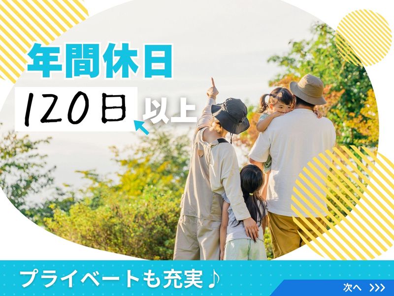 休日休暇 / 年間休日<120日以上!> \ ̄ ̄ ̄ ̄ ̄ ̄ ̄ ̄ ̄ ̄ ̄ ☆週休2日制(日曜+他1日) ☆祝日休み ☆夏季・年末年始休暇 ☆有給休暇 ☆産休・育休(実績あり) . ============= しっかり休んで プライベートも充実♪ =============
