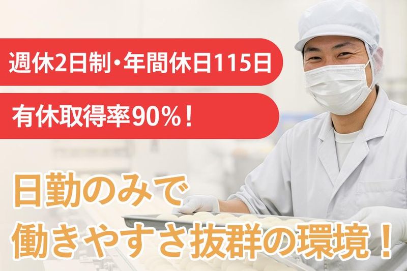 休日休暇 ・週休2日制(工場カレンダーによる) └ 土曜・祝日は基本お休みですが月1~2回程度出勤あり ・年間休日115日 ・年末年始、GW、夏季休暇あり ・有給休暇(取得率90%以上)