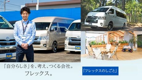 仕事内容 いきなり営業をするのは抵抗がある!そんな方でも大丈夫です!! まずは営業職としてお客様を担当することはございません。 営業スタッフや店舗運営のアシスタントとして ・電話・メール対応 ・お客様のアテンド ・商品車作成フォロー(簡単なパーツの取り付け作業、パーツの発注や業者様との折衝) ・納車作業(洗車や室内清掃作業) ・事務作業(車の写真撮影、見積り作成など) をお任せします! 必要な資格は自動車運転免許だけです!適性を見てより活躍できるポジションをお願いします。 自動車販売店ですので自動車運転免許は必須です。 まずはアシスタントとしてご入社をいただき、半年後にそれまでの適性から判断をし カーライフコーディネーター(営業職)とサービススタッフ(作業職)のどちらかのポジションをお任せします。 実際に見ていたら自信がなくなってしまうこともありますし、そんな場合も活躍が出来る環境です! アウトドア好きなお客様が集まる魅力的な商材を取り扱っています! アウトドアを趣味とするお客様が好むトヨタランドクルーザーとハイエースの専門店を全国で展開しています。 専門店だからとても詳しいです!では終わらずに、お客様の用途や目的に合わせてカスタムまでワンストップで責任をもって現地の判断で実施ができる 裁量権が大きい(自由度が高い)職場環境も強みです。 残業は月平均10時間、福利厚生も充実しています! 営業はお客様とのアポイトメントが前提になりますので、スケジュールの調整がしやすいです。 ※お客様ありきですので店舗によっては残業が発生することがあります。 社割で愛車を安く購入できる社割制度、観光地各所に保有する保養所、もちろん社会保険(厚生年金、健康保険、労災、雇用保険)は完備です。 社員旅行もご用意しております。 カーショップでの新しいキャリアをフレックスは応援します。 フレックスは50年以上続く企業で、直近でも右肩上がりの売上の安定企業です。新車・中古車の自動車販売・整備、中古車の買取、医療ローン、食品の製造販売、旅行事業と幅広く展開しています。営業、事務、軽作業など各種用意していますので希望の職種にご応募ください。
