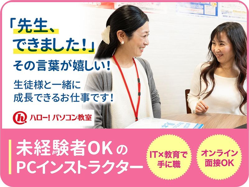 仕事内容 ⭐パソコン教室のインストラクター業務 多くの方がパソコンやスマホを便利に使い、 今までよりもより心豊かな幸せな生活を 送るために学びにより人生が変わる瞬間を お手伝いすることが私たちの使命です。 学生から社会人、主婦、中高年、 シニアの方まで、幅広い生徒様に パソコン操作のサポートをするお仕事です。 ━━━━━━━━━━━━━ ・。* 主な業務*。・ ━━━━━━━━━━━━━ ■生徒様のご質問対応 ■学習プラン・カリキュラム作成 ■予約・出席・レッスン進捗管理 ■問合せなど電話対応 ■入会案内 ■販売促進活動/チラシ配布 ■データ入力 など 生徒様の対応には 主婦パートなど雇用形態問わず ■古着屋等のアパレル販売スタッフ ■カフェ等の接客 ■英語講師、塾講師アルバイト等の 経験が役立ちます。 ⭐パソコンスキルや知識に自信がなくても大丈夫!資格取得も応援! 将来的なパソコンスキルを重視して 採用を行っています。 マイクロソフトオフィススペシャリストや マイクロソフト認定資格プログラムなど資格取得もサポート! パソコンインストラクターや パソコン教室スタッフ、テレアポ、 コールセンタースタッフ、 英語アルバイト等の経験をお持ちの方は 経験や資格を活かして活躍できます。 ⭐この仕事のヤリガイは? 生徒様と直接コミュニケーションが取れて、 『できるようになった!』を 身近で感じられること。 「孫と携帯アプリで 会話できるようになった」 「友達の結婚式で アルバムを作って感謝された」 「資格を取得して就職に繋がった」 など 生徒様の「ありがとう」が やる気に繋がる仕事です。 オープニングスタッフから 長期で働く方も多数在籍! ⭐入社から数年で管理職のポジションに 昇格することも可能です! インストラクターの業務を覚えた後 教室責任者として運営をお任せします。 また、希望や適性などに応じて 複数教室の管理を行なうリーダーへ ステップアップできます。 さらに、意欲のある社員には能力に応じ エリアの管理を行なうチャンスもあり キャリアアップも目指せる環境です。 クリニック受付や受付医療事務等の 経験も活かせます! ゜+.――゜+.――゜+.――゜+.――゜+. <成長はスタッフの努力があるから> 2000年8月の設立以来、 全国で約190校を展開し、 多くの方に選ばれる パソコン教室として成長し続けています。 この成長の背景には、 常に最前線で奮闘する スタッフの日々の努力があります。 スタッフの成長が、直接的に 私たち企業全体の成長に繋がっており、 その価値は計り知れません。 私たちはまだ成長途中の会社ですが、 時代の変化に適応し、 さらなる進化を遂げるために、 現在、スタッフ一人ひとりが自身の ポテンシャルを最大限に発揮できる 職場環境の構築に取り組んでいます。 <まずはオンライン面接でお会いしましょう!> 面接では、私たちが大切にしている価値観やビジョンをお伝えしたいと考えています。 あなたがリラックスして自分自身を表現できる環境で、あなたのこれまでの経験や、強みをお聞かせください。 お互いの理解を深めあなたが活躍できる機会について、詳しくお伝えしたいと思います。 どんな疑問や質問も歓迎しますので、遠慮なくお聞かせください。