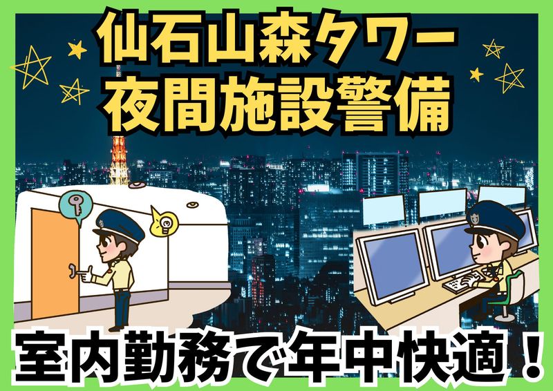 仕事内容 六本木一丁目駅より徒歩5分! 仙石山森タワーの受付・巡回・モニター監視等のシンプルなお仕事です。 挨拶をしたり、人と話したりするお仕事なので、コミュニケーションを取ることが好きな方にもオススメです! 【お仕事内容詳細】 ・関係者の出入管理(入館証管理) ・防災センター業務(巡回、モニター監視等)など まずは研修からスタート! お仕事の説明や、言葉遣いなど、座学&実践で丁寧に教えます。 解らない事など、何でも気軽に質問してくださいね。 未経験からお仕事を始めたスタッフさんがほとんどですので安心してくださいね。 【様々な方が活躍中!】 シンテイ警備では20代・30代・40代・50代・60代と 若い方からミドル・中高年・60歳以上のシニア年代の方まで、様々な方が活躍しています。 それぞれの方が希望に合わせた働き方を実現できるのは、 お仕事多数のシンテイ警備だからこそ! あなたの働き方もきっと見つかります。