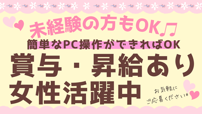 求めている人材 \明るく対応ができれば応募資格は◎/  ̄ ̄ ̄ ̄ ̄ ̄ ̄ ̄ ̄ ̄ ̄ ̄ ̄ ̄ ̄ ̄ *基本PC操作できる方 (Excel・Word・タイピングなど) *女性活躍中 *30代・40代女性中心に活躍中 *ブランク歓迎 *PC得意な方大歓迎 経験のある方もない方も まずはお気軽にご応募ください☆