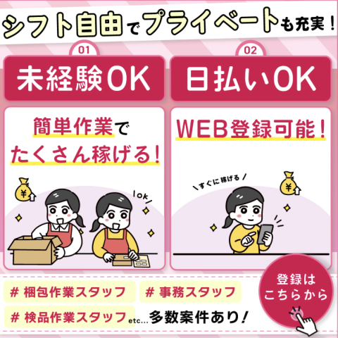 【単発OK/365日稼働】送迎バスでラクラク通勤の軽作業 単発OK!!ご都合に合わせてお仕事ができます♪ 人気のお仕事ですので早めのご応募をお待ちしております。 高時給で、夜勤、都合に働くことができます♪ ★お小遣い稼ぎがしたい ★友達同士での応募も大歓迎 ★Wワークでお小遣い稼ぎしたい ★ブランクからの職場復帰でまずは単発から働きたい ★天候関係なく働ける ★未経験・初心者の方も大歓迎 ★履歴書不要のカンタンWEB登録 ★嬉しい日払いです! ★冷暖房完備 ★社員食堂の利用も可能です! ・・・問い合わせだけでもOK!何でも聞いてください!