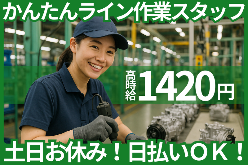 仕事の内容 出張面接随時対応しています! お気軽にご相談ください!! - おすすめポイント ●GW、夏季、年末年始に長期連休あり! ●休憩スペース、ロッカーあり! ●売店、自販機あり! ●社員食堂利用OK! ●送迎あり規定有 ●お給料の日払い対応しています!(規定あり) ●すぐに生活できるワンルーム寮あります!(規定あり) - 自動車用のエアコンに使われる コンプレッサー部品の工場での 組み立てや検査のお仕事です。 <仕事内容> ライン作業でのお仕事で、 基本的には立ち作業です。 ●手作業や工具(電動ドライバー)などを使い、 部品を組付ける ●出来上がった製品に不良がないか 外観を検査する (不良の例:傷、汚れ、部品の抜けなど) ●出来上がった製品の移動、梱包 製品の大きさは種類によりさまざまですが、 基本的に置いてある製品に組み付けます。 - <仕事のポイント> ●入社前・入社直後の研修あり! 初めての方も安心して始められます。 ●働きながらスキルアップ! 組み立てや検査、 電動工具のスキルを磨けます。 ものづくりのお仕事に興味のある方、 お持ちのスキルを磨きたい方にも オススメのお仕事です。 - 一日の流れ(日勤の場合、一例) 8:10 始業 10:00 休憩 10:10 作業再開 11:55 昼休み 12:35 後半の勤務開始 15:00 休憩 15:10 作業再開 17:00 終業 お疲れ様でした! - 同じ会社で2交替の仕事もあります! ~働くポイント紹介~ ◇寮について◇ 家具家電完備のワンルームのお部屋をご用意しています。 ●通常初期費用0円! ●一般の賃貸物件を借り上げているので、 しっかりと管理されている物件です! ●会社全体で何件か借り上げているので、 勤務先までの通勤しやすさだったり、 ご自身の生活スタイルに合った 利便性の確保もしやすいです! (コンビニ・スーパー・銀行などが近い物件をご用意しています。) ●家具、家電のレンタル相談もOK ◇日払い制度◇ 専用のカードを使って コンビニATMでお給料日前に お給料の一部が受け取れるサービスです。 毎日お金がカードに加算されるので 好きな時にお金を引き出すことができます。 ◇職場環境等◇ 長く、安心してお仕事できるよう、 以下の取り組みを通じて 労働環境の整備を進めています。 ●男女比 男性2:女性1 ●社員食堂 ICカードで精算らくらく! ●ロッカーあり 貴重品の保管も安心! ●敷地内に売店・自販機あり 軽食や飲み物をお安く買えます! -