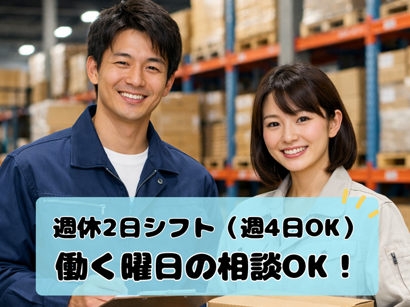 仕事内容 **✨**✨**✨**✨ 日勤×週休2日シフト制 7~21時の好きな時間で8h◎ 週4日勤務も相談OK ✨**✨**✨**✨** 物流倉庫での入出庫作業をお任せします。 ・入庫商品の荷下ろしと数量確認 ・商品ピッキング ・パレットへの積み付け(出庫作業) トラックで届いた商品の荷下ろしや数量チェック、倉庫内での商品のピッキングやパレットへの積み付けなど軽作業です。 リフト作業は専任のスタッフが担当するので、免許・資格は一切必要なし! 先輩スタッフがしっかりとレクチャー&フォローを行うので、倉庫作業が初めての方もご安心ください◎ ✅日勤帯のみ!働きたい時間を相談できるので、自分のライフスタイルに合わせて働くことができます。 ✅週休2日シフト制。出勤できる曜日を教えてください!週4日勤務も相談可能です。 ✅服装も自由!動きやすい格好でOKです。 ✅急な出費時にも安心!週払い制度あり◎ 20~40代の男女が活躍しており、もくもくマイペースにお仕事したいという方におすすめです◎ まずはお気軽にご応募ください!
