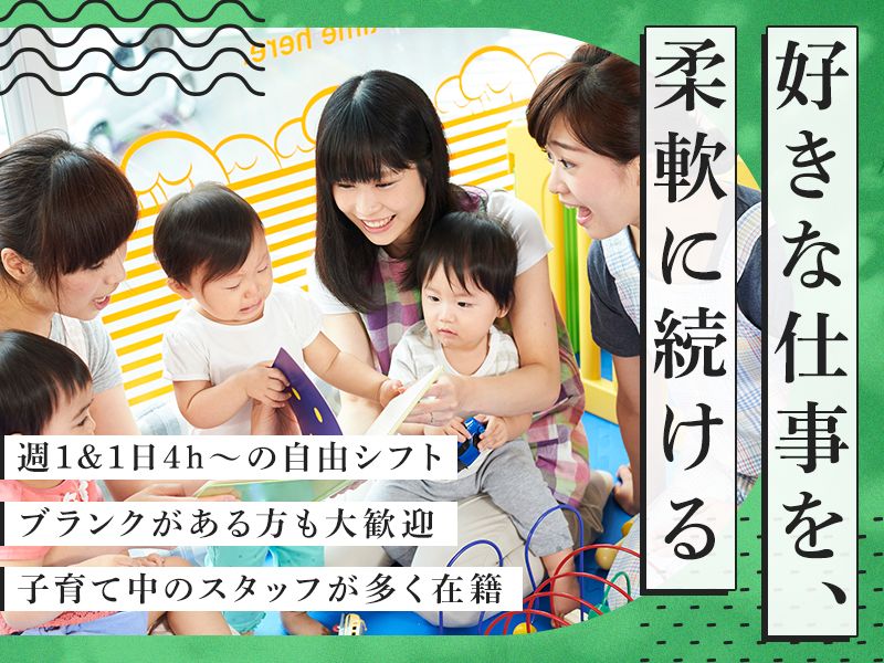 仕事内容 卒園した子どもたちが、 時を経て保護者や先生として 戻ってくるあたたかい園✨ 私たちの一番の魅力は… \ 週1日、1日4h~勤務OK / 家庭や育児と両立しやすい環境です! ‥‥●まだあるココが魅力●‥‥ ✅ブランクOK!教育体制バッチリ ✅新卒・第二新卒歓迎! ✅職員の休憩スペースあり♪ ✅交通費全額支給✨ ✅人間関係が良好!定着率が高め✨ ‥‥‥●仕事内容●‥‥‥ 日々の生活と成長を支えながら、 子ども一人ひとりに寄り添う保育。 落ち着いた環境で働けます。 【 具体的には 】 1|遊びや活動の見守り 2|給食サポート・おむつ替え 3|書類作成・保護者対応 \ ココも嬉しい♪ / トイレ・手洗い場の清掃は外部委託 その分、子どもたちに向き合ったり、 別の業務を終わらせたりできます。